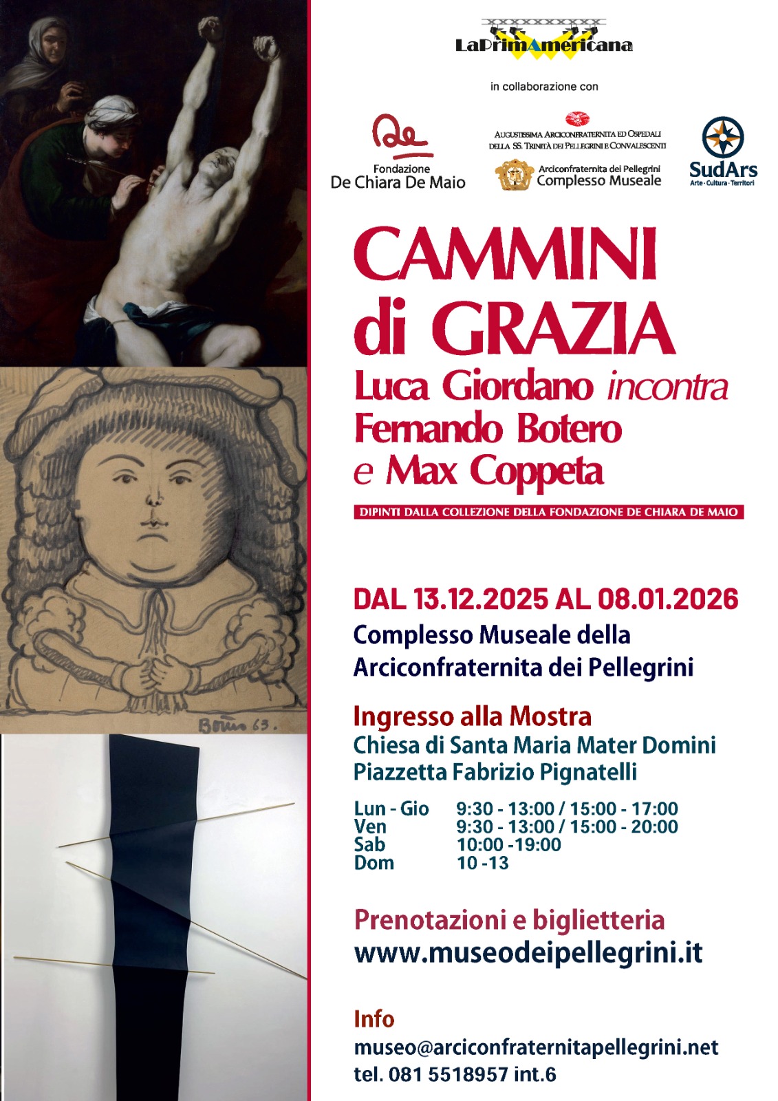 Cammini di Grazia presenta opere di Luca Giordano, Maestro del Seicento napoletano, affiancate, in un dialogo inedito e sorprendente, ai linguaggi di Fernando Botero e Max Coppeta, generando un trittico di sguardi sul senso della fragilità umana e del riscatto spirituale.